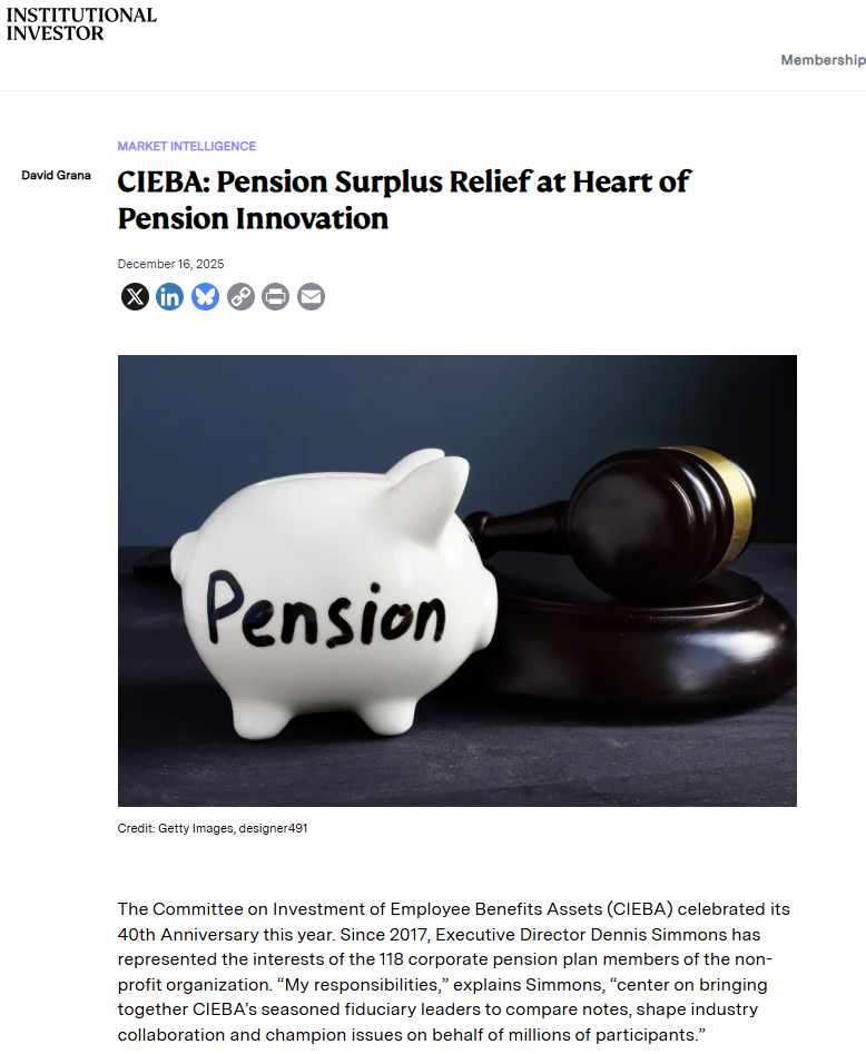 CIEBA, the Committee on Investment of Employee Benefit Assets, represents 120 of the country's largest pension and defined contribution trusts. Its members manage more than $2.5 trillion of defined benefit and defined contribution plan assets on behalf of more than 16 million participants and beneficiaries. As the largest organization of private plan investment officers, CIEBA represents the interests of chief investment fiduciaries of employee benefit plans in front of legislators, Congress, regulators, and the media. Click here to learn more. Recent Meeting HighlightsSpotlight on CIEBA 2025 Annual Meeting & Celebration of CIEBA’s 40th AnniversaryClick Here to Read the ArticleSpotlight on our June 2025 Working Group Meeting